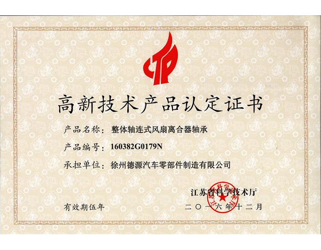 公司产品:整体轴连式风扇离合器轴承,获江苏省高新技术产品认定证书