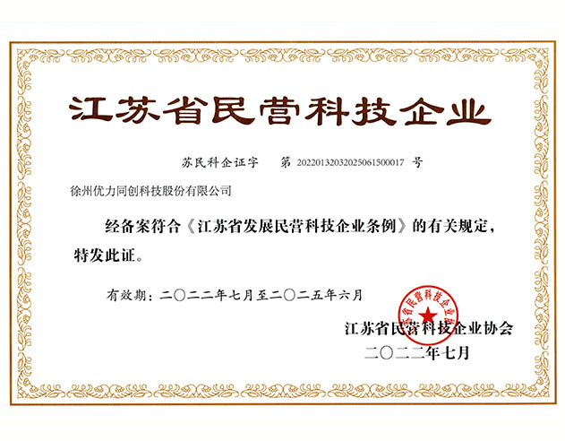公司于2022年7月获江苏省民营科技企业协会颁发江苏省民营科技企业证书